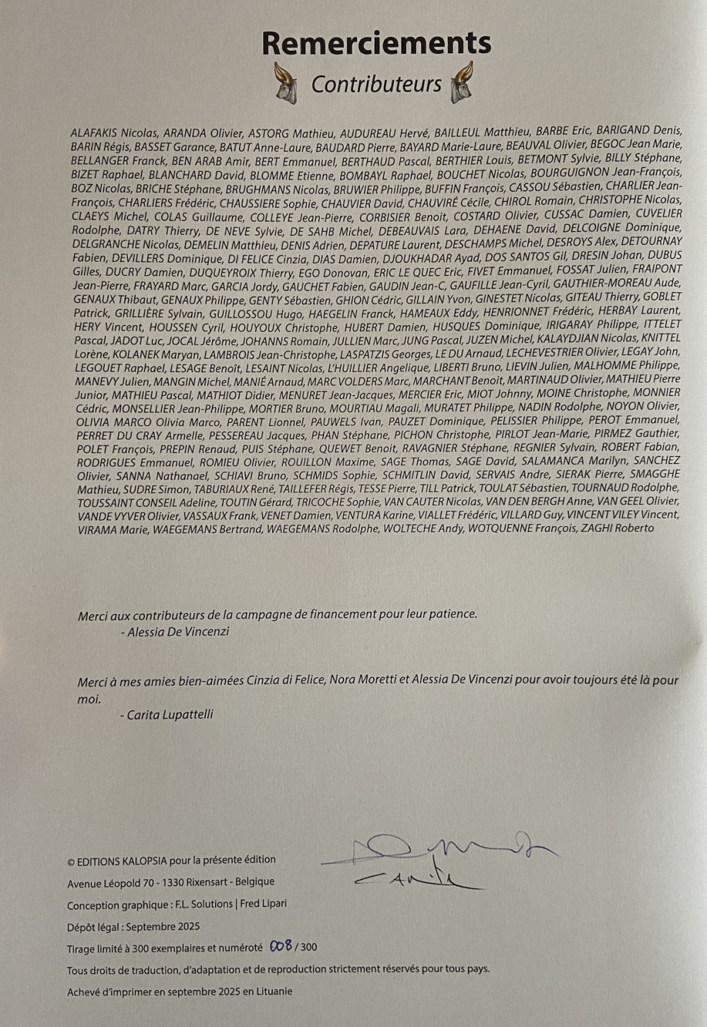 Info édition : Tirage spécial sur papier Munken Lynx 150 gr avec dos toilé rouge, limité à 300 exemplaires signés et numérotés de 1 à 300 (cf. "autre image"). Inclus un dossier supplémentaire de 8 pages de croquis. Pas d'ISBN pour ce tirage. Un ex libris limité à 200 exemplaires numérotés, signé par le scénariste, la dessinatrice et la coloriste est inclu pour les 150 contribut.eur.rice.s de la campagne de financement participatif ainsi que pour les 50 premi.er.ère.s acheteu.r.se.s (cf. image "planche").