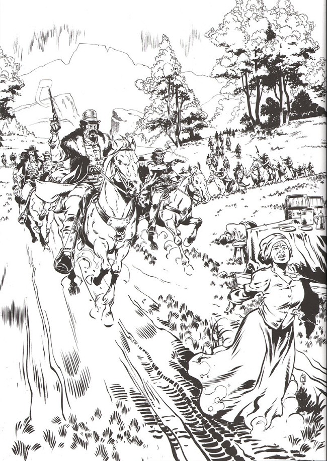 Je me dois de rectifier tout de suite une erreur probable: non, Texas Jack n'est pas l'album des débuts du Marshal Sykes. Il s'agit bien d'un projet distinct et c'est ce qui fait toute sa force (et vaguement inspiré d'un personnage historique). Ce n'est ni le succès de leur précédente collaboration ni l'appât du gain qui les ont poussé vers ce qui aurait pu être une démarche commerciale. En fait cet album vient d'une envie de refaire un western, grand format, en prenant le temps de montrer les grands espaces, les chevauchées interminables, la nature et les relations humaines de cet alliage improbable d'artistes et de gunmen. L'existence de Sykes leur permet d'introduire quelques personnages connus mais ils ne sont aucunement au cœur de l'intrigue et restent même plutôt périphériques. Une sorte de coloration permettant de bâtir un univers étendu.