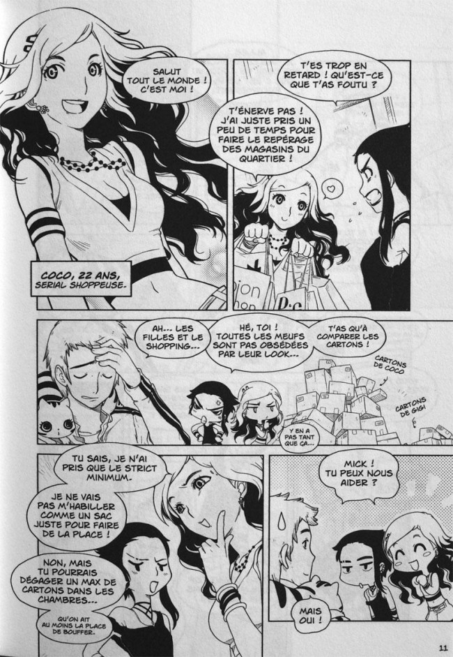 Coco, parfaite serial shoppeuse, rêve de devenir guitariste, mais cherche un petit boulot en attendant. Gigi, la rebelle du groupe, est la seule parisienne de la bande. Légèrement aigrie et très indépendante, elle se consacre à la peinture et au dessin. Côté garçons, nos deux héroïnes sont bien servies ! On retrouve Mick, le bon pote playboy toujours prêt à aider et Jon, l’étudiant en lettres un peu naïf.