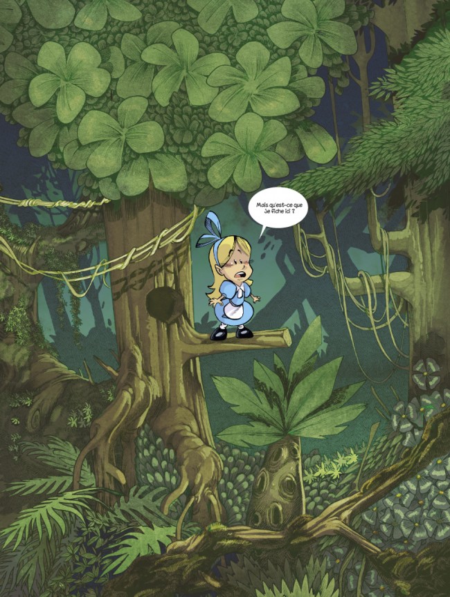 Au pays des singes, on n’est pas plus raisonnable qu’au pays des merveilles… L'accident bête : en courant après le Lapin Blanc, Alice a pris une noix de coco sur la tête. Sonnée par le choc, elle tombe dans un trou, et émerge en plein milieu de la jungle ! La pauvre est complètement paumée, et ses ennuis ne sont pas finis : tous les singes qu'elle croise la prennent pour Tarzan Heureusement, Eddy le mandrill finit par la croire, et la prévient : il faut qu'elle déguerpisse fissa, pour éviter les dents du tigre ! Ce dernier est en effet devenu Seigneur officiel de la jungle depuis le départ de lHomme-Singe. Mais retourner d'où elle vient ne va pas être de la tarte, puisque l'arbre dont elle a émergé a déjà pris la poudre d'escampette Tebo débride son imagination, et nous emmène dans une jungle absurde et hilarante, peuplée de personnages à contre-emploi et complètement déjantés ! Le dessin impeccable de son camarade de délire Keramidas fait de cet album une fable tout public des plus mémorables.