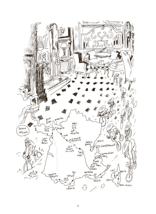 Pour la centième édition du Tour de France, Joann Sfar a fait la Grande Boucle avec France Inter. Il a composé sur le vif un mélange inédit de textes, d'illustrations et de bandes dessinées pour dire la caravane, des héros de la course à ceux qui peuplent les virages. Entre ferveur et dépression, toujours avec humour, il raconte son pays : la France qui pédale.