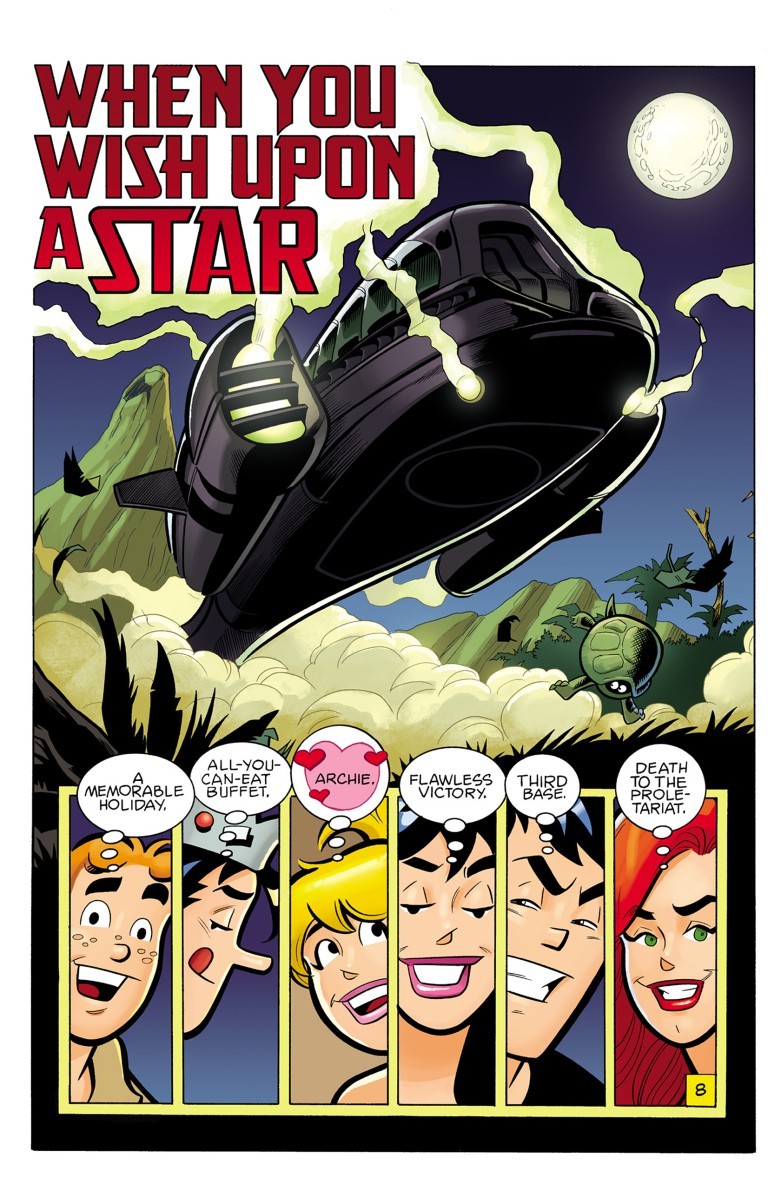 Archie Vs. Predator is a 2015 4-issue miniseries written by Alex de Campi and drawn by Fernando Ruiz released under the publication of Dark Horse Comics and Archie Comics. Similar to Chilling Adventures of Sabrina or Afterlife with Archie, its aim is to take the Archie cast and put them into a more mature Alternate Continuity setting, this time mixing up some sci-fi elements with the horror by pitting the iconic teen from Riverdale against 20th Century Fox's Predator. Unlike the other two series however, instead of being drawn in their more realistic style it's drawn in the usual Archie Comics style, with the story hitting more familiar Archie beats.