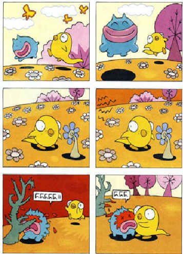 Beaten up, tattered, and weather worn, this volume has crossed through space to become the first extra-terrestrial comic book in print on earth. The language and even the alphabet are alien, but as human readers will soon discover, the themes and stories are universal. These interwoven stories and vignettes start out quite simply, but a darker, more complex side is gradually revealed as alien characters act out very human problems, from peer pressure to intolerance to the challenges of friendship. Beneath its apparently childlike and cartoony style, A.L.I.E.E.E.N. explores human nature, cruelty, and kindness with surprising depth and loads of humor.