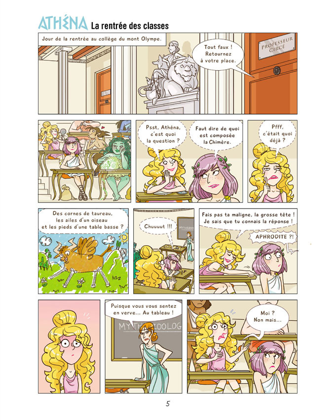 Visite pédagogique aux enfers, atelier tragédie, expédition au fond de l'océan... C'est le programme pédagogique de l'école du mont Olympe, où Athéna et ses camarades apprennent leur métier de futurs dieux et déesses ! Gaïa et Aphrodite sont ses deux super amies, et Cerbère son chiot à trois têtes veille jalousement sur elle. D'autant plus qu'à la différence de ses camarades, Athéna n'est pas certaine d'avoir encore découvert son pouvoir. C'est sur ces entrefaites qu'arrive Osiris, le correspondant égyptien d'Athéna. Mais pas tout seul, puisqu'il est accompagné de sa chatte Bastet... Bref, vous l'avez deviné : ça va swinguer sur l'Olympe !