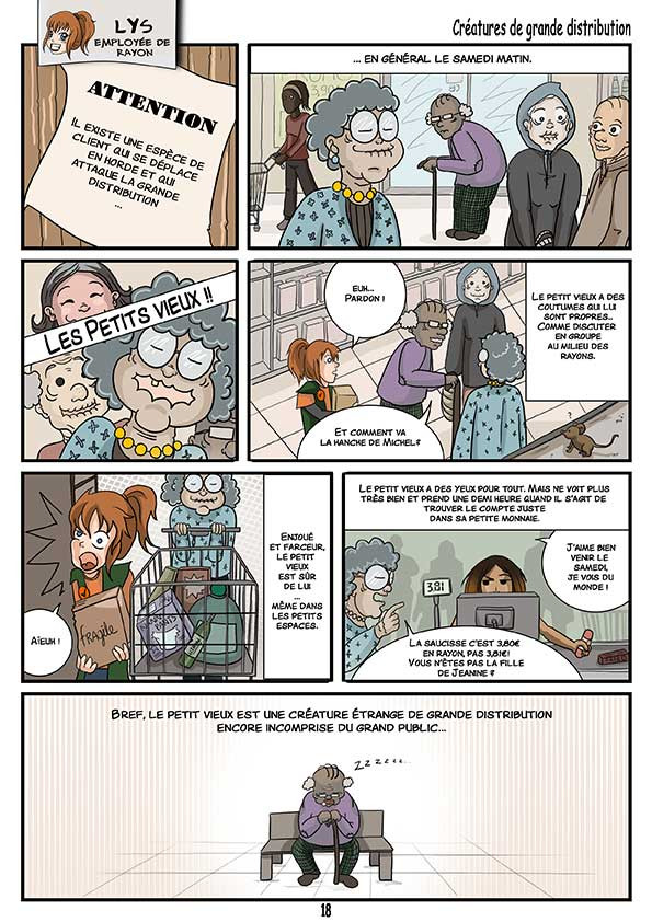 Qu'on le veuille ou non, nous sommes tous acteurs du marché de la grande distribution. De simple usager à employé, en passant par le légendaire "client chiant", cette BD retrace les fous rires et désolations de l'auteure à travers toute une série d'anecdotes vécues dans sa carrière dans la "grande distrib'". Caissièr(e)s, vendeus(e)s, employé(e)s de rayons, patron(ne)s ou client(e)s, régalez vous avec cette peinture humoristique et bienveillante de l'univers du commerce alimentaire !