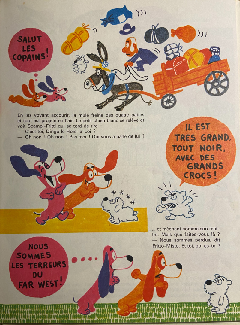 Fritto-Misto et Scampi-Fritti sont deux jeunes chiens, des bassets artésiens-normands, deux petits frères qui s'aiment beaucoup et à qui il arrive mille aventures car il sont dévorés de curiosité et veulent visiter le monde entier. Scampi-Fritti est un petit écervelé ; c'est lui le plus curieux des deux et il est toujours prêt à faire des bêtises. Fritto-Misto est beaucoup plus sage, il se fait toujours du souci mais ils s'entendent très bien.