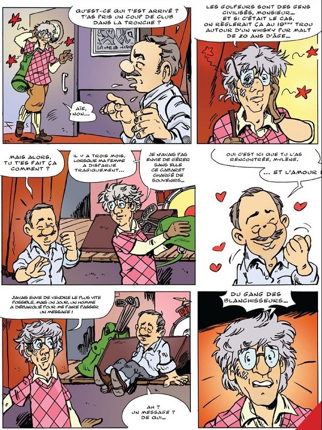 48 pages d'aventures délirantes où nos Célèbres Charlots (Jean, Jean-Guy et Richard) devront se dépêtrer des griffes d'une terrible organisation aussi mafieuse que maléfique : le gang des blanchisseurs.