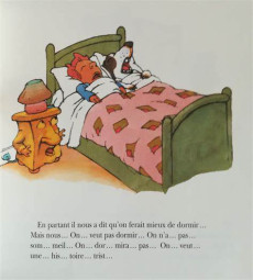 Le petit garçon et son chien en ont marre de ce papa rigolo qui raconte toujours des histoires à mourir de rire ; ce qui leur ferait plaisir à eux, c'est une histoire triste à pleurer ; Ah ! C'est comme ça ! braille soudain la table de chevet jaune en sautant sur leur lit. Eh bien ! Vous allez être servis !Voilà une histoire ni follement triste, ni follement gaie. Voilà une histoire échevelée où l'imagination débridée de Philippe Corentin fait des ravages