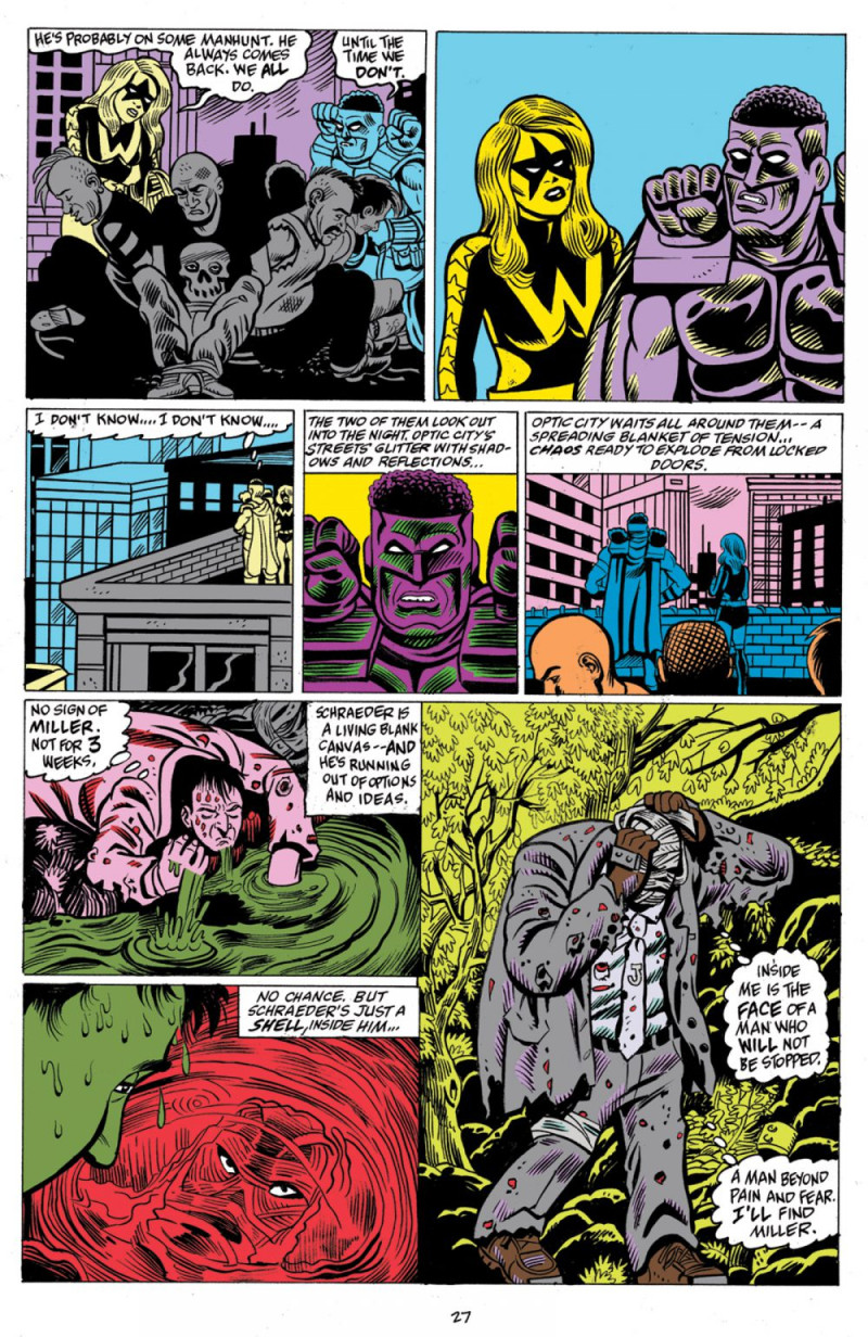 These four heroes face an over-the-top lineup of villains including The Misogynist, Raingod, White Warlock, Krimson Kross, P.S.Y.C.H.O., and the Time Vampire.
